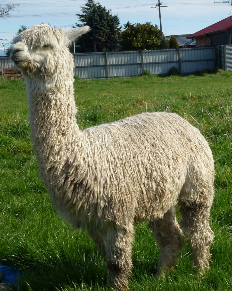 BobbyBop is a proven dam to a lovely well grown female cria born in 2015. She is a very attentive mother. Her first fleece was a beautifully soft, lustrous golden colour which has subsequently paled significantly to a more light fawn. She grows a good weight of fleece