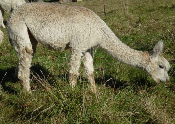 Her sire is the 2010 NZ National Supreme Champion who carries an exquisite fleece. Her dam is from 2 black suri and so she carries strong colour genes.